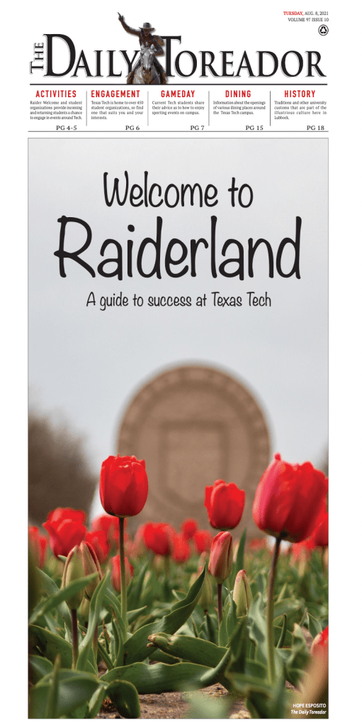 The Daily Toreador, Texas Tech’s student-run newspaper. The DT, as it is known on campus, has never missed a scheduled day of publication since its inception in 1925. The student editorial and advertising staffs are responsible for all content within the paper and on the website. The newspaper also serves as a designated public forum for members of the campus community to voice their opinions free from administrative control or censorship.